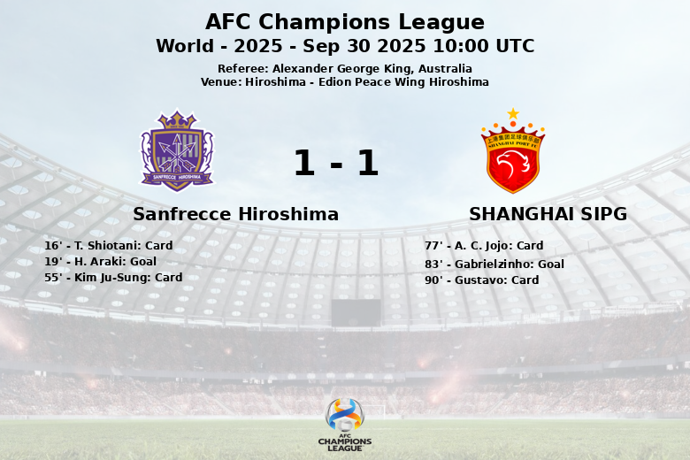 Hiroshima, Japan – Sanfrecce Hiroshima and Shanghai SIPG played to a draw in an exciting AFC Champions League match held at the Edion Peace Wing Hiroshima. The match, officiated by Alexander George King from Australia, was characterized by 59% possession in favor of the home team, which generated 20 shots, 10 of them on target.