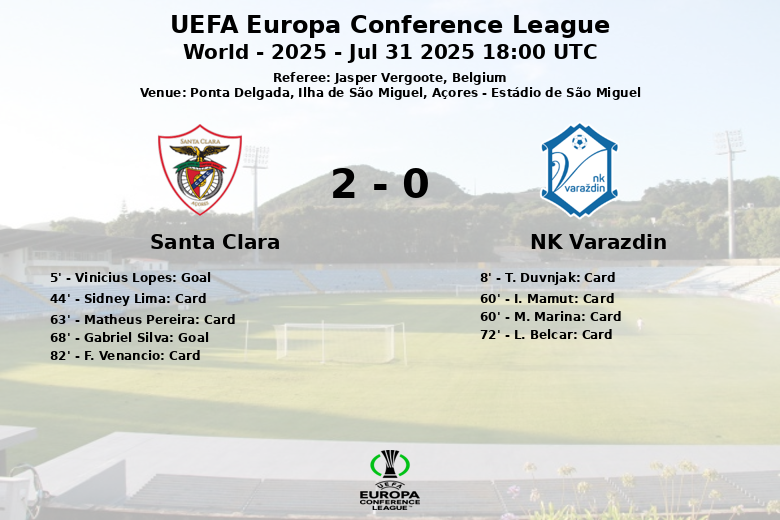 Santa Clara took an early lead in the 5th minute, thanks to a goal by Vinicius Lopes. The match continued intensely, marked by numerous fouls (17 by each team) and yellow cards: two for Santa Clara (Sidney Lima in the 44th minute, Matheus Pereira in the 63rd minute and F. Venancio in the 82nd minute) and four for NK Varazdin (T. Duvnjak in the 8th minute, I. Mamut in the 60th minute, M. Marina in the 60th minute and L. Belcar in the 72nd minute).