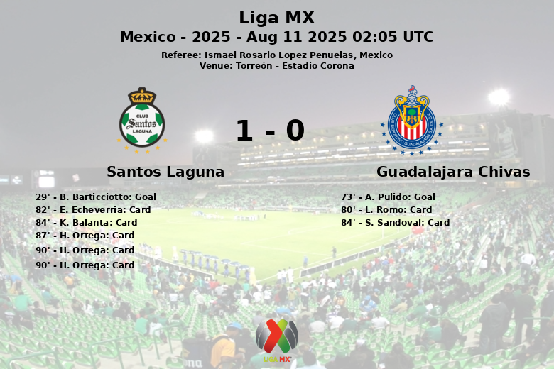 Substitutions santos laguna: at minute 56 J. Carrillo came in and C. Dajome went out., at minute 76 F. Villalba came in and E. Echeverria went out., at minute 76 B. Barticciotto came in and J. A. Ocejo Zazueta went out., at minute 90 R. Sordo came in and K. Palacios went out.