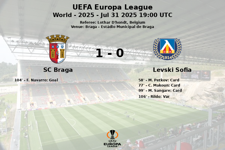 Braga, Portugal – In a closely contested match held at the Estádio Municipal de Braga on July 31st, as part of the 2nd Qualifying Round of the 2025 UEFA Europa League, SC Braga defeated Levski Sofia in a game that went to extra time. The match, officiated by Lothar D’hondt from Belgium, was characterized by its intensity and several cautions, with three yellow cards shown to the Bulgarian team.