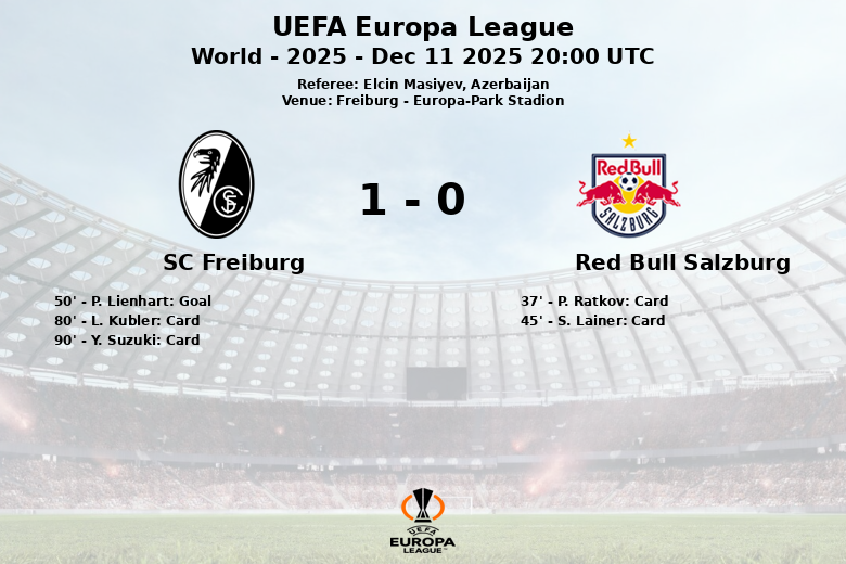 In the second half, Freiburg managed to open the scoring in the 50th minute thanks to a goal by P. Lienhart. Salzburg, despite playing with one man less, tried to react, but Freiburg’s defense remained solid. The match continued with high intensity, reflected in the yellow cards shown to L. Kubler and Y. Suzuki of Freiburg in the 80th and 90th minutes respectively. The final score reflected Freiburg’s superiority in possession and opportunities, although Salzburg fought despite the numerical disadvantage. Azerbaijani referee Elcin Masiyev officiated the match.