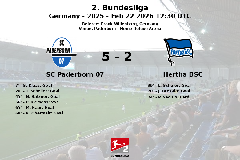 In the second half, a goal by M. Baur from a penalty and another from R. Obermair consolidated Paderborn’s victory. J. Brekalo scored for Hertha BSC in the 70th minute, assisted by F. Reese, but it was not enough to change the course of the match. Though Paderborn had a goal disallowed by VAR due to an offside. The match was refereed by Frank Willenborg.