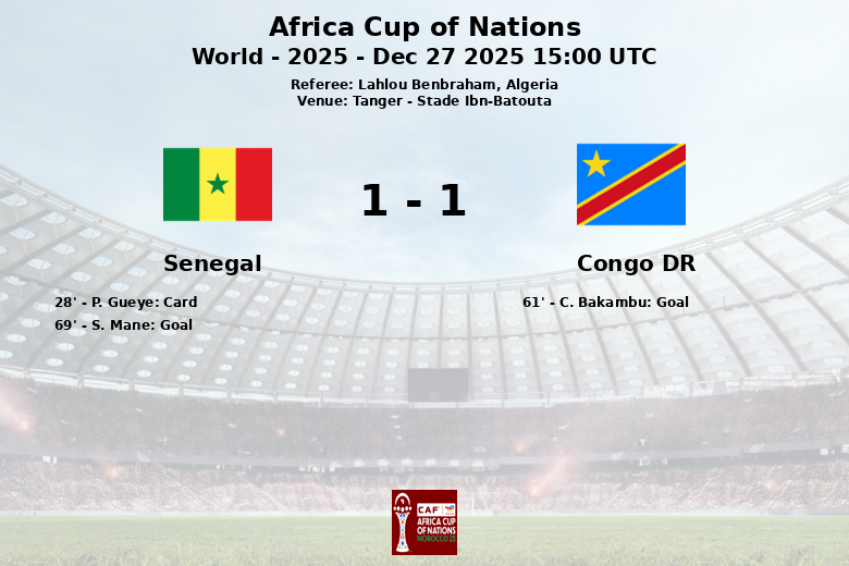 Tangier, Morocco – In a hard-fought match at the Stade Ibn-Batouta, Senegal and DR Congo played to a draw in their Africa Cup of Nations group stage match. The game, officiated by Algerian referee Lahlou Benbraham, saw Senegal dominate possession with 64%, although DR Congo proved effective in their attacks.