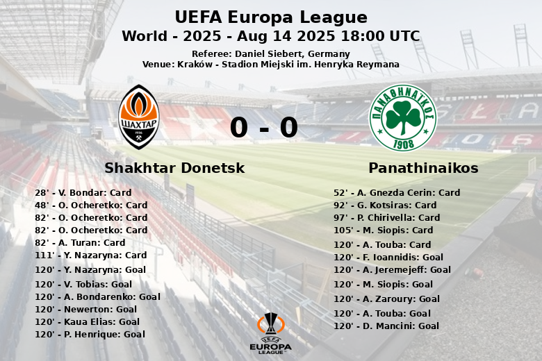 Krakow, August 14, 2025 – A tense and emotional match unfolded today at the Stadion Miejski im. Henryka Reymana, where Shakhtar Donetsk and Panathinaikos clashed in the 3rd Qualifying Round of the UEFA Europa League. German referee Daniel Siebert had a busy night, brandishing a total of 10 yellow cards, 4 for Shakhtar and 6 for Panathinaikos.