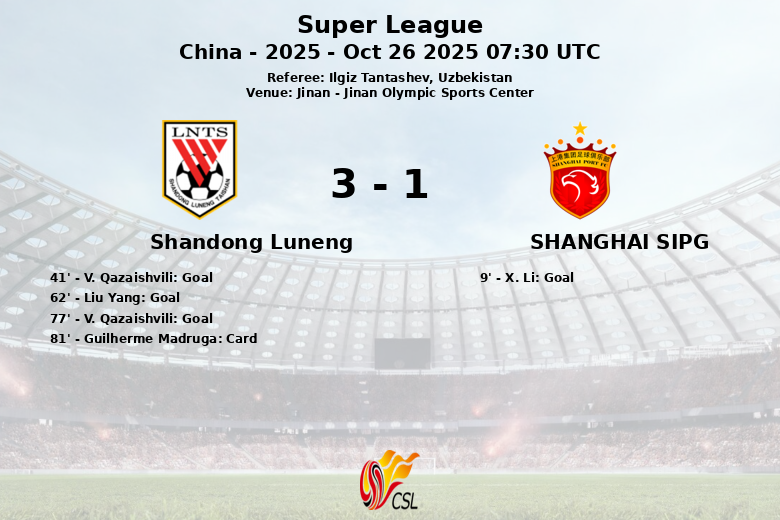 Jinan, China – In a vibrant match held at the Jinan Olympic Sports Center, Shandong Luneng defeated Shanghai SIPG with a final score of 3 to 1. The match, corresponding to matchday 28 of the Chinese Super League, 2025 season, was refereed by Ilgiz Tantashev from Uzbekistan.