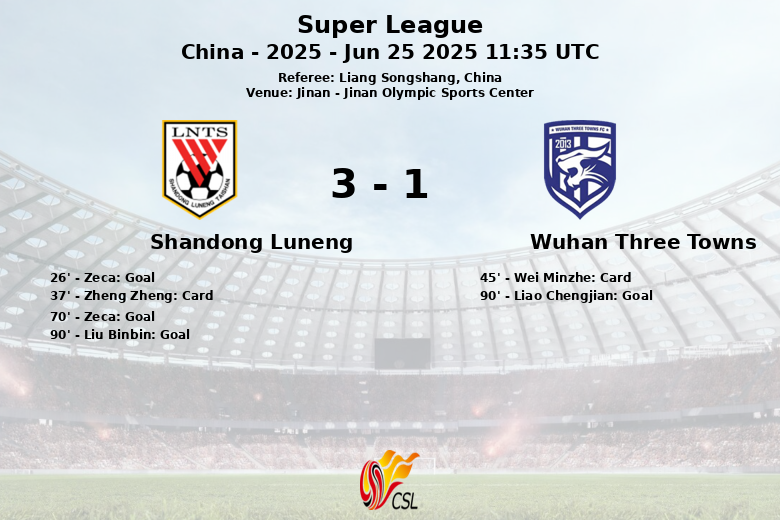 The first goal came in the 26th minute, courtesy of Zeca, who capitalized on an excellent assist from Xie Wenneng to open the scoring. The first half also saw a yellow card for Zheng Zheng of Luneng and a crucial red card for Wei Minzhe of Wuhan Three Towns just before halftime, leaving the visiting team with ten men.