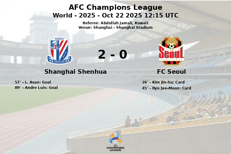 The first half passed without goals, although with two yellow cards for FC Seoul, shown to Kim Jin-Su and Ryu Jae-Moon. In the second half, Shanghai Shenhua opened the scoring in the 57th minute with a goal by L. Asue, assisted by J. Teixeira. FC Seoul sought the equalizer but failed to convert their opportunities, despite making 20 shots, 5 of them on target.