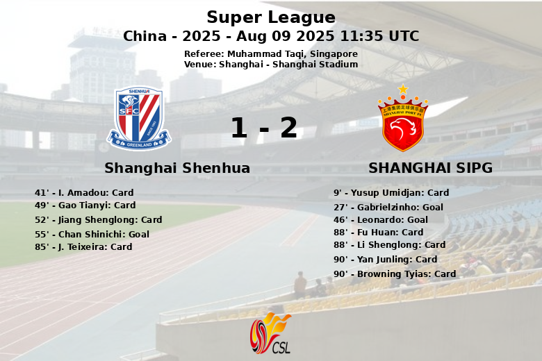 SHANGHAI SIPG opened the scoring in the 27th minute with a goal from Gabrielzinho, assisted by Liu Ruofan. The lead was extended at the start of the second half, in the 46th minute, thanks to Leonardo, who capitalized on an assist from Li Shuai. Shanghai Shenhua responded in the 55th minute with a goal from Chan Shinichi, reducing the deficit.
