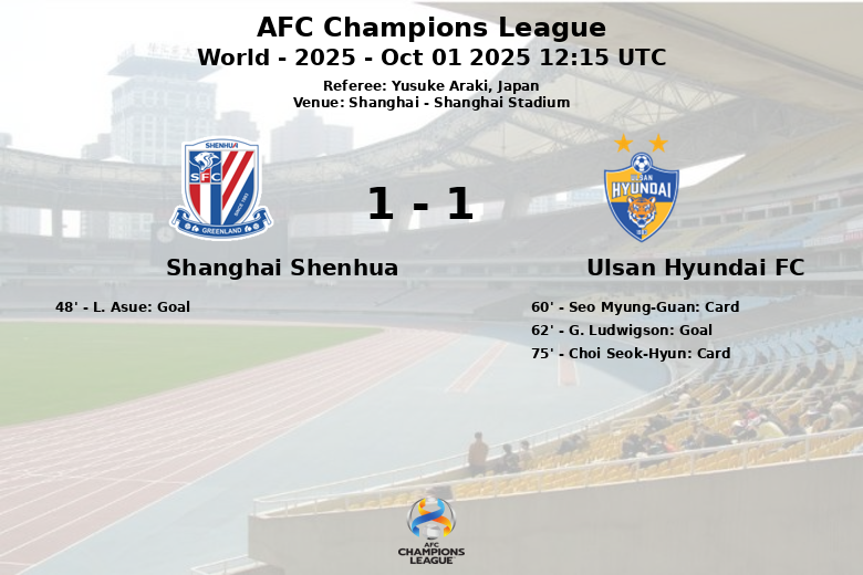 Shanghai Shenhua took the lead in the 48th minute thanks to a goal by L. Asue, after a play that sparked euphoria in the home stadium. However, Ulsan Hyundai FC did not give up and persistently sought the equalizer. The Korean pressure paid off in the 62nd minute, when G. Ludwigson equalized the score with a goal assisted by Ko Seung-Beom.