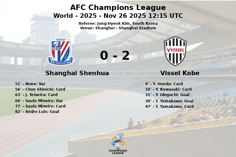 VAR disallowed a goal for Shanghai Shenhua in the 51st minute and another in the 66th minute, the latter due to a foul. Andre Luis managed to score for the home team in the 82nd minute, taking advantage of a missed penalty, but the reaction was too late. The match was also characterized by a high number of yellow cards, with three for each team. Vissel Kobe controlled the pace of the game, recording 9 total shots (4 on target) and 4 corners, while Shanghai Shenhua had 12 total shots (3 on target) and 6 corners.