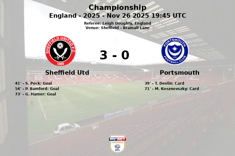 After the break, Sheffield United extended their lead with goals from P. Bamford in the 54th minute and G. Hamer in the 73rd minute, cementing a victory that reflects their dominance on the pitch. Portsmouth, with 4 total shots and 36% possession, could not counter the home team’s offensive. Additionally, M. Kosznovszky received a yellow card in the 71st minute.