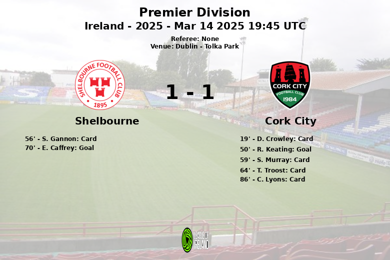 Despite dominating possession (61% vs 39%), Shelbourne struggled to convert their advantage into goals until the second half. Cork City took the lead in the 50th minute with a goal from R. Keating. Shelbourne responded with a goal from E. Caffrey in the 70th minute, securing the draw.