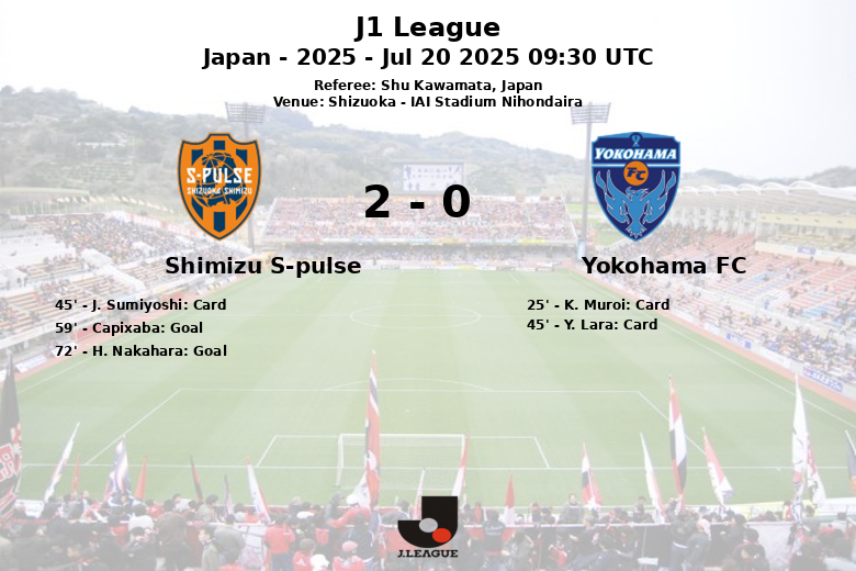 Shimizu S-pulse’s dominance was reflected in ball possession, with 67% compared to Yokohama FC’s 33%. The home side generated more goal-scoring opportunities, with 14 total shots, of which 2 were on target and 4 went wide. Capixaba opened the scoring in the 59th minute, following a play with no apparent assist, and H. Nakahara sealed the match in the 72nd minute, with an assist from S. Yajima.