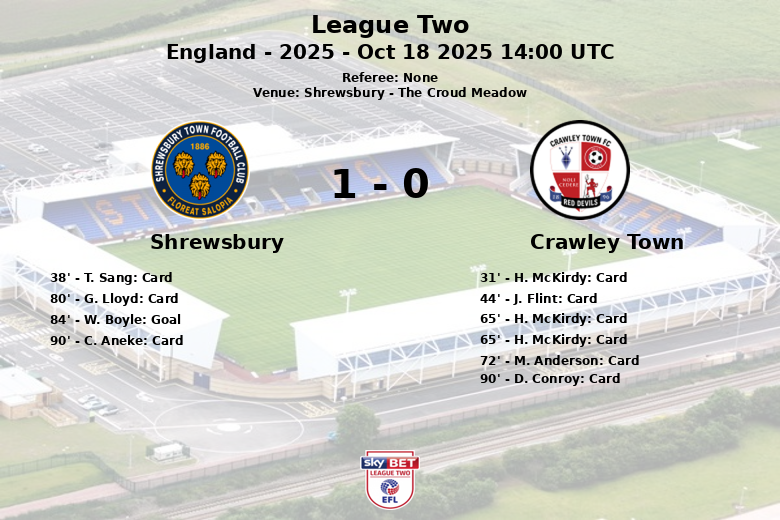 The only goal of the match came in the 84th minute, scored by W. Boyle after an assist from S. Clucas, unleashing euphoria among the home fans. The match ended with a total of seven yellow cards, five for Crawley Town and two for Shrewsbury, reflecting the intensity and contested play in every inch of the field. Ball possession was not enough for Crawley Town who saw their player expelled and their scoring opportunities dwindled as the game progressed.