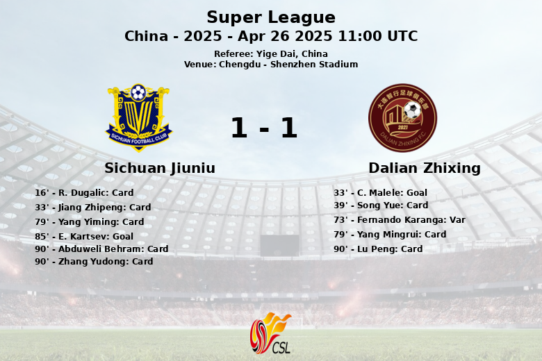 Dalian Zhixing took the lead in the 33rd minute with a penalty converted by C. Malele. However, a goal by Fernando Karanga was disallowed by VAR in the 73rd minute for offside. Sichuan Jiuniu fought back strongly in the second half, equalizing in the 85th minute through a goal by E. Kartsev, assisted by M. Sarkaria.