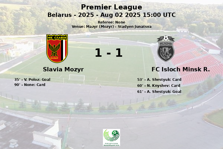 Mazyr, Belarus – In a hard-fought match at the Stadyen Junatsva, Slavia Mozyr and FC Isloch Minsk R. drew in a game corresponding to matchday 16 of the Belarusian Premier League. Slavia Mozyr took the lead in the 35th minute thanks to a goal by V. Poloz, assisted by A. Solovey. However, FC Isloch Minsk R. reacted in the second half. Despite receiving two yellow cards for A. Shestyuk and N. Knyshev, the visiting team found the equalizer in the 61st minute with a goal by A. Shestyuk, assisted by Knyshev. The match, marked by intensity and midfield battles, ended with a yellow card for Slavia Mozyr in added time. Although statistics for possession, shots, corners, and fouls are unavailable, the final score reflects a balanced and competitive game.