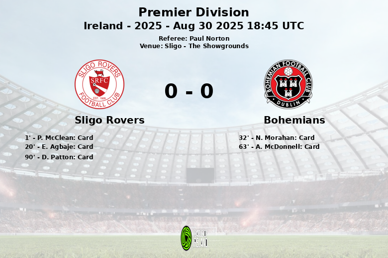Sligo, Ireland – In a hard-fought encounter at The Showgrounds, Sligo Rovers and Bohemians played out a 0-0 draw in their Premier Division clash, Round 29. Referee Paul Norton had a busy afternoon, issuing yellow cards to both sides. P. McClean and E. Agbaje of Sligo Rovers, alongside N. Morahan and A. McDonnell from Bohemians, were cautioned during the match.