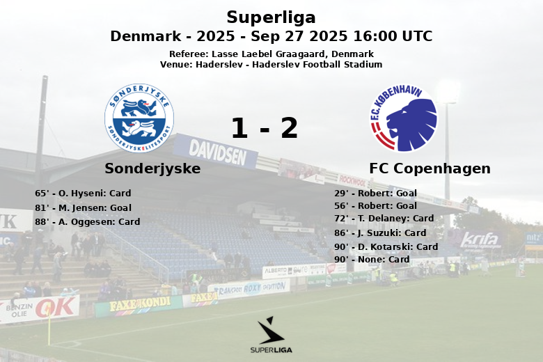 Haderslev, Denmark – In a match held at the Haderslev Football Stadium, FC Copenhagen secured a victory against Sonderjyske with a final score of 2 to 1. The game, part of the Superliga’s round 10, was officiated by Lasse Laebel Graagaard.