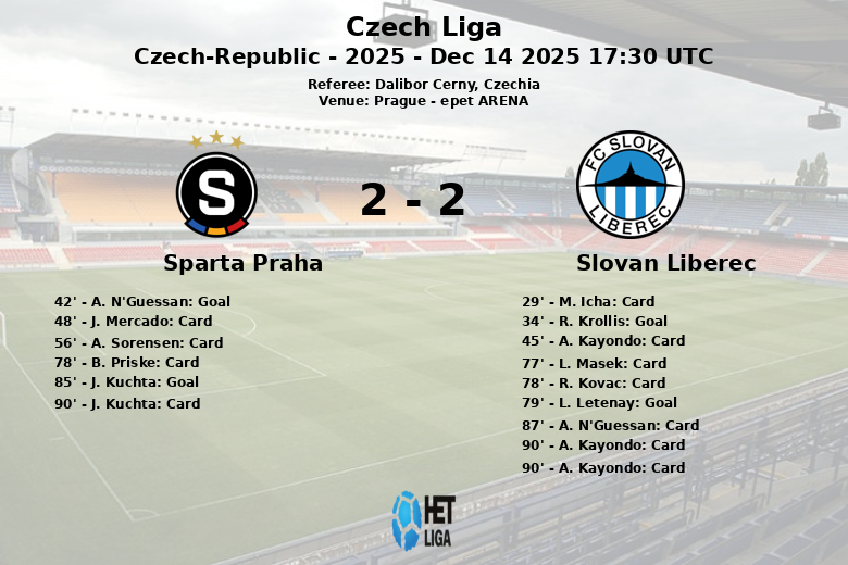 Prague, December 14, 2025 – An exciting match at the epet ARENA saw Slovan Liberec defeat Sparta Praha in a game filled with cards and decisive moments. Despite Sparta Praha’s dominance in possession (75% compared to Liberec’s 25%) and their superiority in shots on target (8 compared to 3), Slovan Liberec capitalized on their chances and defended tenaciously.