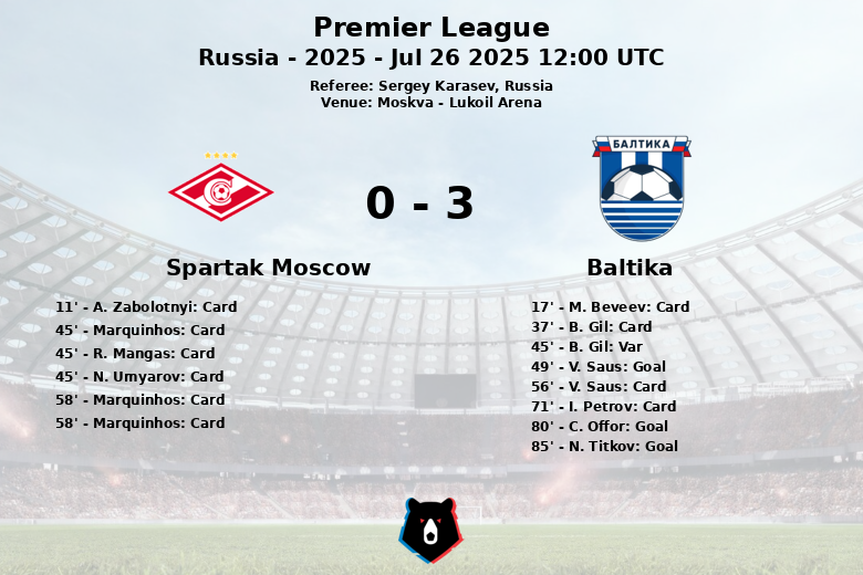 Baltika took advantage of their superiority to seal the match with goals from C. Offor in the 80th minute and N. Titkov in the 85th minute, thus securing a well-deserved victory. The match, corresponding to the second round of the regular season of the Russian Premier League, ended with a total of 16 fouls by Baltika and 11 by Spartak. In addition, the referee showed 4 yellow cards to Baltika and 4 yellow cards and 2 red cards to Spartak. A Baltika goal was disallowed by VAR in the 45th minute. Spartak Moscow barely managed to make 3 shots, none of them on target, while Baltika generated 22 chances, 10 of them directed at the opponent’s goal.