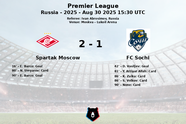 Spartak Moscow vs FC Sochi Aug 30 2025 15:30 UTC