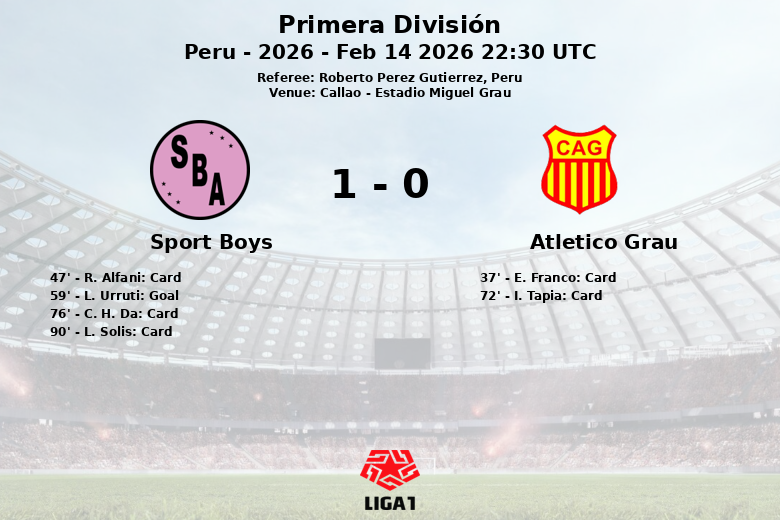 Referee Roberto Pérez Gutiérrez issued a total of four yellow cards during the match, two for each team. E. Franco and I. Tapia were cautioned for Atlético Grau, while R. Alfani, C. H. Da, and L. Solis received yellow cards for Sport Boys. Both teams committed a significant number of fouls, with Atlético Grau surpassing Sport Boys 15 to 11. Despite their dominance in possession and higher number of fouls, Atlético Grau failed to capitalize on their opportunities and ended up conceding the three points to Sport Boys in this match corresponding to the third matchday of the Peruvian First Division.