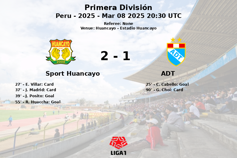 Sport Huancayo defeated ADT 2-1 in a thrilling match played at the Estadio Huancayo in Huancayo, as part of the fifth round of the Apertura stage of the 2025 Peruvian Primera División. Although ADT dominated possession with 64%, Sport Huancayo proved more effective in attack. C. Cabello opened the scoring for ADT in the 25th minute, assisted by J. Vidales. However, Sport Huancayo came back with goals from J. Posito (39th minute, assisted by E. Fernandez) and R. Huaccha (55th minute). The match was marked by tension, with two yellow cards for Sport Huancayo (E. Villar and J. Madrid) and a red card for G. Choi of ADT in the closing stages. Despite ADT’s territorial dominance (17 shots, 4 on target), Sport Huancayo showed effectiveness with 12 shots, 6 of them on target.