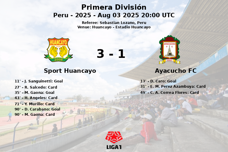 The match started at a frantic pace. In the 11th minute, J. Sanguinetti opened the scoring for Sport Huancayo. The joy was short-lived, as D. Caro equalized for Ayacucho FC just two minutes later. M. Gaona put Sport Huancayo ahead again in the 35th minute, following an assist from Sanguinetti. The first half was also marked by several yellow cards.