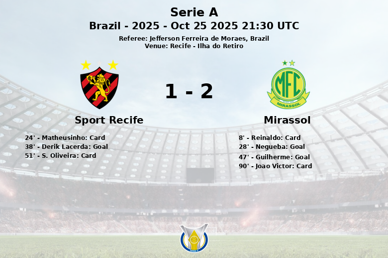 The match began with a yellow card for Reinaldo of Mirassol in the 8th minute. Tension escalated in the 24th minute when Matheusinho of Sport Recife was sent off with a red card, leaving his team with ten men. Despite playing with a man down, Sport Recife managed to equalize the game thanks to a goal from Derik Lacerda in the 38th minute, assisted by S. Oliveira.