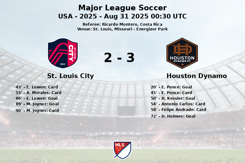 Houston Dynamo took the lead thanks to a goal by E. Ponce in the 20th minute, assisted by J. McGlynn. The first half was marked by intensity and disputes, reflected in the yellow cards shown to E. Lowen of St. Louis City and E. Ponce of Houston Dynamo.