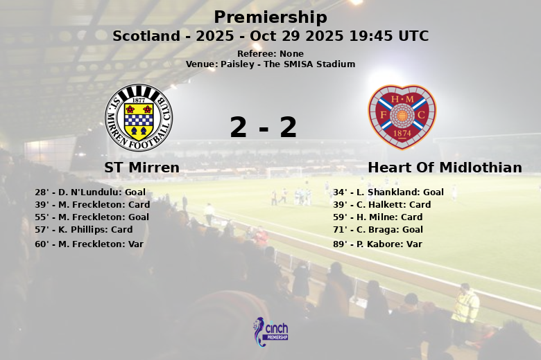 In the second half, M. Freckleton put ST Mirren ahead again in the 55th minute. However, his goal was disallowed by VAR minutes later. The tension remained high, with further yellow cards for K. Phillips of ST Mirren and H. Milne of Heart Of Midlothian. C. Braga of Heart Of Midlothian equalized the match in the 71st minute. The end of the match was frantic, with another goal disallowed by VAR, this time to P. Kabore of Heart Of Midlothian in the 89th minute.