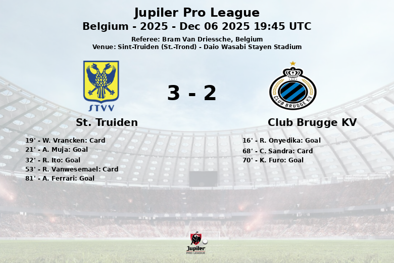Sint-Truiden (St.-Trond), Belgium – In a match played at the Daio Wasabi Stayen Stadium, St. Truiden and Club Brugge KV drew in a game full of twists and turns. Club Brugge KV, with more ball possession (57%), opened the scoring in the 16th minute with a goal by R. Onyedika, assisted by C. Tzolis. However, St. Truiden responded quickly. A. Muja equalized in the 21st minute, and R. Ito put the home side ahead in the 32nd minute with a penalty. The first half was marked by intensity and physical play, reflected in the yellow card shown to W. Vrancken of St. Truiden.