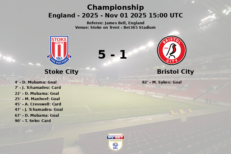 Stoke on Trent – Stoke City unleashed an offensive storm in their match against Bristol City, securing a resounding victory at the Bet365 Stadium. From the start, the home dominance was palpable, reflected in 57% ball possession. D. Mubama emerged as the star of the match, scoring a crucial hat-trick (minutes 4, 22, and 67) that cemented Stoke’s victory. M. Manhoef contributed with a goal in the 25th minute and assisted J. Tchamadeu, who also scored in the 47th minute.