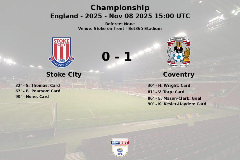 The match was punctuated by several interruptions, reflected in the 8 fouls committed by Stoke City and the 9 by Coventry, as well as the yellow cards shown to both teams. Finally, a goal by E. Mason-Clark in the 86th minute, assisted by E. Simms, tilted the scales in favor of Coventry, sealing the match and granting them three valuable points. The game witnessed 3 corners for Stoke City and 6 for Coventry.