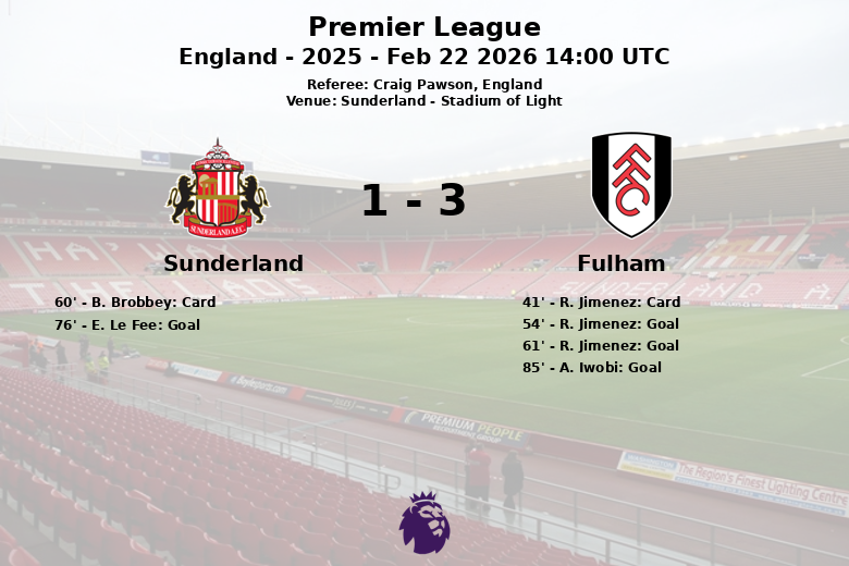 The first goal of the match came in the 54th minute when Fulham’s R. Jimenez, assisted by A. Iwobi, broke the deadlock. Jimenez would score again, this time from the penalty spot, in the 61st minute to extend Fulham’s lead. Sunderland responded with a penalty goal by E. Le Fee in the 76th minute, but A. Iwobi sealed the victory for Fulham in the 85th minute with a goal, assisted by H. Wilson, ensuring Fulham walked away with the three points.