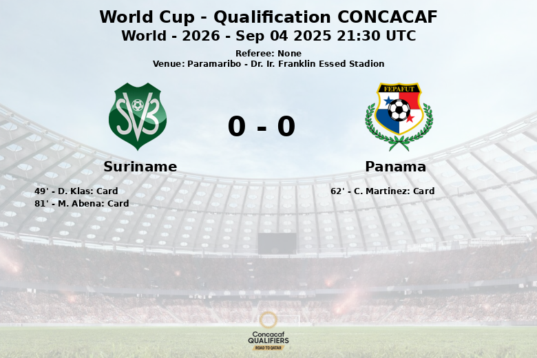 The Panamanian team earned a higher number of corners, with 10 compared to Suriname’s 3. The game was interrupted by a total of 17 fouls, 7 committed by Suriname and 10 by Panama. The referees issued three yellow cards: two to Suriname players (D. Klas and M. Abena) and one to a Panama player (C. Martinez). No players were sent off. The match concluded with a score of zero to zero.