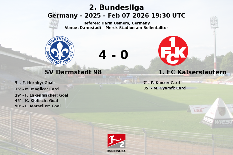 Darmstadt, Germany – In a vibrant match held at the Merck-Stadion am Bollenfalltor, SV Darmstadt 98 secured a commanding victory over 1. FC Kaiserslautern in a match corresponding to matchday 21 of the 2. Bundesliga. Referee Harm Osmers officiated the game.