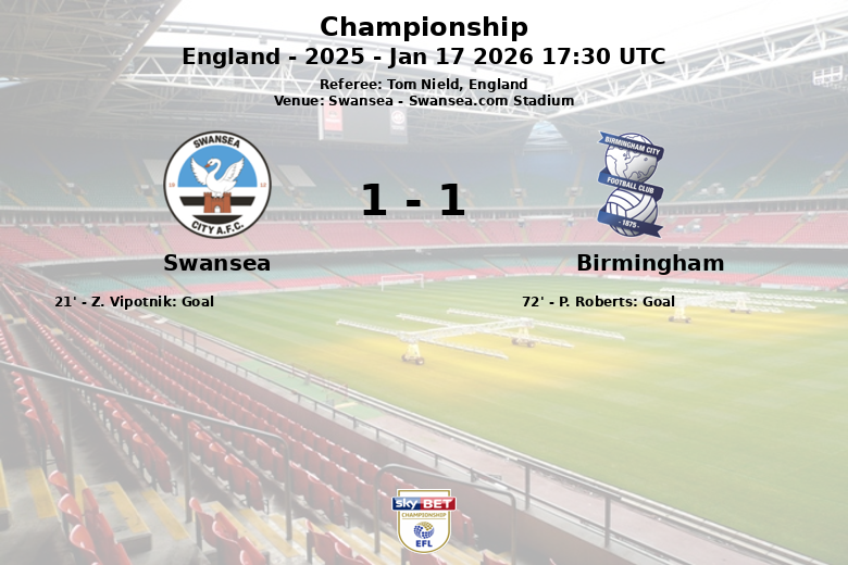 Swansea took the lead in the 21st minute with a goal by Z. Vipotnik, assisted by G. Franco. However, Birmingham responded in the 72nd minute with a goal by P. Roberts.