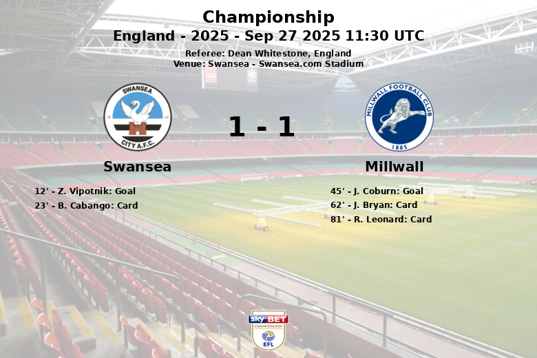 Swansea took an early lead in the 12th minute thanks to a goal by Z. Vipotnik, assisted by Ronald. The home side seemed to be in control, but Millwall, playing with pragmatism, managed to equalize just before halftime. J. Coburn, assisted by J. Cooper, found the back of the net in the 45th minute, silencing the home crowd.