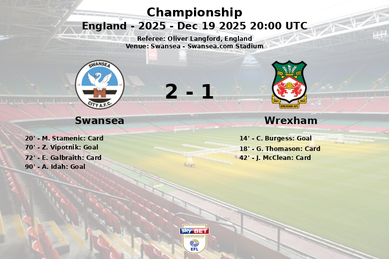 Swansea equalized in the 70th minute with a goal by Z. Vipotnik, assisted by Ronald. In the final minutes of the match, A. Idah sealed the victory for Swansea in the 90th minute. The match was also characterized by intense play, with a total of 18 fouls committed between both teams and four yellow cards shown (two for each team). Despite having 7 corners, Wrexham was unable to score.