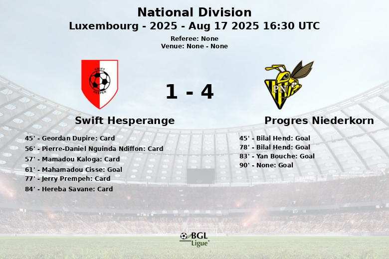 In the final minutes, Yan Bouche extended the lead for Progres Niederkorn, consolidating their dominance. An additional goal at the end of the match sealed the victory for Progres Niederkorn. Swift Hesperange, despite generating several dangerous situations through corner kicks, failed to capitalize on them and was outmatched by a more effective Progres Niederkorn in finishing. The high number of fouls committed reflected the intensity of the match.