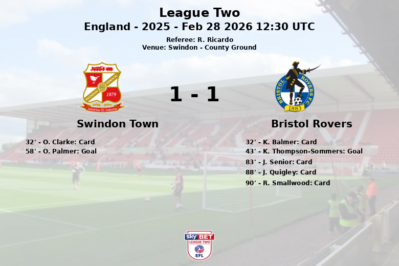 Bristol Rovers took the lead in the 43rd minute thanks to a goal by K. Thompson-Sommers, assisted by E. Harrison. However, Swindon Town managed to equalize in the 58th minute with a goal by O. Palmer, assisted by J. Batty.