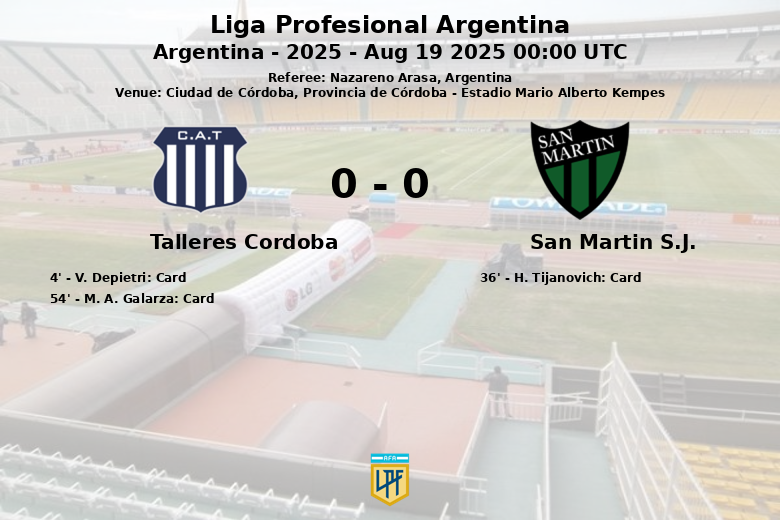In a match held at the Estadio Mario Alberto Kempes in the City of Córdoba, Talleres de Córdoba and San Martín de San Juan faced off in a game corresponding to the Liga Profesional Argentina. Talleres imposed their game, dominating ball possession with 64% compared to San Martín’s 36%. This dominance translated into a higher number of scoring chances, with 16 total shots for Talleres, 8 of which were on target, while San Martín only managed 9 shots, with 3 directed at the goal.