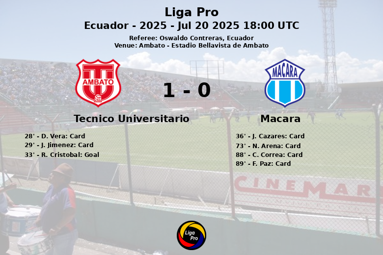 Ambato, Ecuador – In a hard-fought match held at the Estadio Bellavista de Ambato, Técnico Universitario defeated Macará in an Ecuadorian Liga Pro game marked by its intensity and numerous yellow cards. The sole goal of the match came in the 33rd minute, scored by R. Cristobal, assisted by T. Minda, giving the home team the decisive advantage.