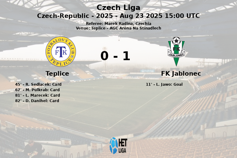 Teplice, Czech Republic – In a match corresponding to the sixth round of the Czech Liga, FK Jablonec secured a valuable away victory against Teplice at the AGC Aréna Na Stínadlech. The only goal of the match, scored by L. Jawo in the 11th minute with an assist from A. Alegue, made the difference in a tactical and hard-fought game.