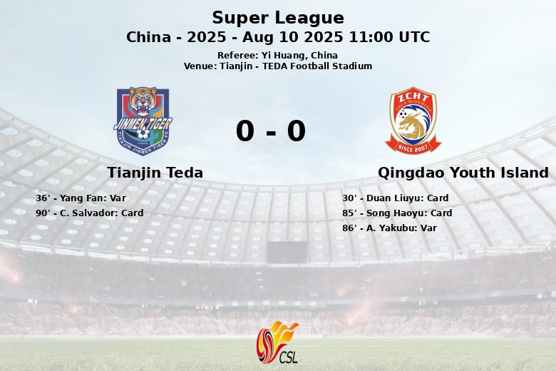 The game was mired in controversy when, in the 36th minute, a goal by Yang Fan for Tianjin Teda was disallowed after a VAR review for a prior handball. In the second half, Qingdao Youth Island suffered a similar fate in the 86th minute, when a goal by A. Yakubu was ruled out for offside, also after VAR intervention.
