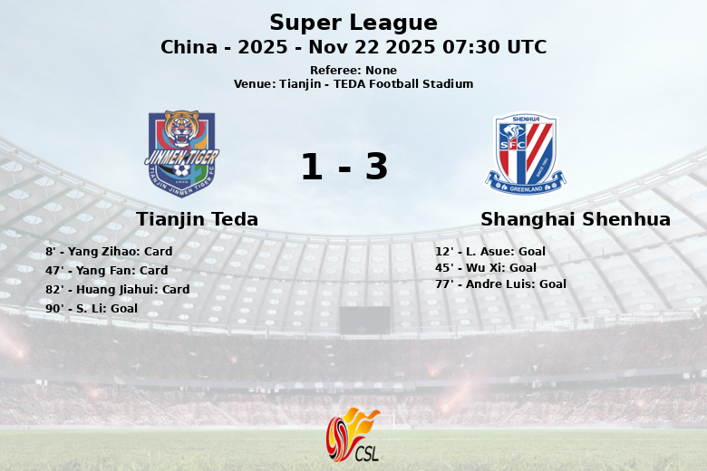 The scoring opened early, in the 12th minute, with a goal by L. Asue for Shanghai Shenhua. The lead was extended just before halftime, in the 45th minute, with a penalty converted by Wu Xi. Although Tianjin Teda enjoyed greater ball possession (60%) and sought to reverse the situation, their game was interrupted by several fouls and yellow cards, including one for Yang Zihao in the 8th minute and another for Yang Fan in the 47th minute, as well as one for Huang Jiahui in the 82nd minute.