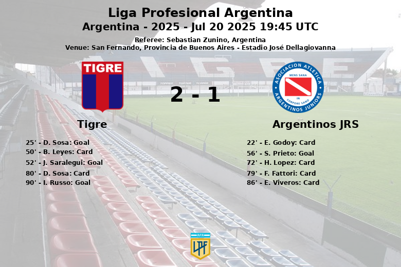 The match began with intensity, marked by a yellow card for E. Godoy of Argentinos Juniors in the 22nd minute. Three minutes later, D. Sosa of Tigre missed a penalty, but managed to redeem himself by converting the rebound. The first half concluded with Tigre in the lead.