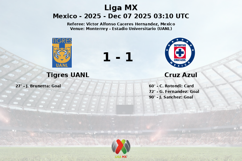 Monterrey, Mexico – In a match filled with emotion and controversy, Tigres UANL and Cruz Azul drew two-all at the Estadio Universitario in the Liga MX semi-final. The match, played on December 7, 2025, saw Tigres take the lead in the 27th minute with a goal by J. Brunetta, assisted by A. Gignac. Cruz Azul dominated possession with 60%, demonstrating greater offensive aggression with 15 total shots, compared to Tigres’ 10. Despite this, the feline defense remained firm. The second half was even more frantic. Cruz Azul fought to equalize, but G. Fernandez missed a penalty in the 72nd minute. However, Celeste’s persistence paid off and, in an unexpected turn, J. Sanchez scored an own goal in the 90th minute, leveling the final score. The match was marked by high intensity, reflected in the 17 fouls committed by Tigres and a yellow card shown to C. Rotondi of Cruz Azul. The referee, Victor Alfonso Caceres Hernandez, had a busy night in a match that left everything to be decided in the return leg.