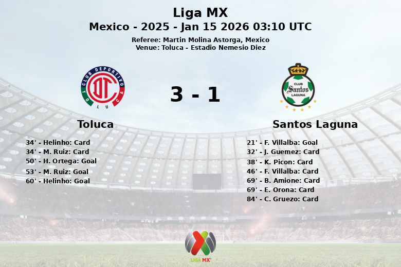 Santos Laguna started strong, with a goal by F. Villalba in the 21st minute, assisted by E. Bullaude. However, the lead wouldn’t last. Toluca reacted in the second half, capitalizing on an own goal by H. Ortega in the 50th minute to equalize. Shortly after, M. Ruiz put the home side ahead with a goal in the 53rd minute. Toluca’s dominance was completed with a penalty converted by Helinho in the 60th minute.